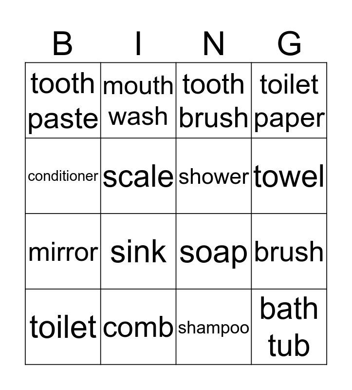 This bingo card has 16 words: comb, brush, tooth brush, tooth paste, mirror, mouth wash, soap, shampoo, conditioner, scale, toilet, toilet paper, sink, towel, shower and bath tub.