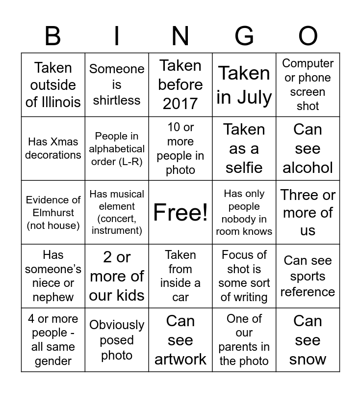 This bingo card has a free space and 24 words: 2 or more of our kids, Obviously posed photo, 10 or more people in photo, 4 or more people - all same gender, Computer or phone screen shot, Taken outside of Illinois, Has Xmas decorations, Someone is shirtless, Has only people nobody in room knows, Taken from inside a car, Taken as a selfie, Evidence of Elmhurst (not house), Focus of shot is some sort of writing, Can see sports reference, People in alphabetical order (L-R), One of our parents in the photo, Three or more of us, Taken before 2017, Can see alcohol, Has musical element (concert, instrument), Can see snow, Has someone’s niece or nephew, Taken in July and Can see artwork.