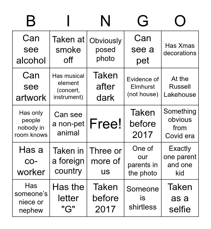 This bingo card has a free space and 24 words: Taken in a foreign country, Has the letter "G", Taken after dark, Has someone’s niece or nephew, Has Xmas decorations, Can see alcohol, Can see artwork, Taken at smoke off, Taken before 2017, Three or more of us, Evidence of Elmhurst (not house), Has only people nobody in room knows, One of our parents in the photo, Exactly one parent and one kid, Has musical element (concert, instrument), Someone is shirtless, Something obvious from Covid era, Obviously posed photo, At the Russell Lakehouse, Can see a non-pet animal, Taken as a selfie, Has a co-worker, Can see a pet and Taken before 2017.