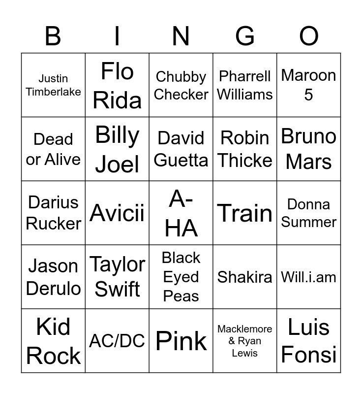 This bingo card has 50 words: Village People, A-HA, Joan Jet and the Blackhearts, Pink, Taylor Swift, Christina Aguilera, Flo Rida, Usher, Dead or Alive, The Beatles, Billy Joel, Pharrell Williams, Will.i.am, Shakira, Jennifer Lopez, Pitbull, David Guetta, Train, DJ Adam, Maroon 5, Avicii, Macklemore & Ryan Lewis, Justin Timberlake, Robin Thicke, Ed Sheeran, Luis Fonsi, Bruno Mars, Meghan Trainor, Chubby Checker, Black Eyed Peas, ABBA, Los Del Mar, The Cult, Nirvana, AC/DC, The cranberries, Guns N' Roses, Skid Row, Ozzy Osbourne, Donna Summer, Backstreet Boys, Kenny Loggins, Beegees, Lynard Skynyrd, Kid Rock, Darius Rucker, Coldplay, Walk the Moon, Jason Derulo and ABBA.