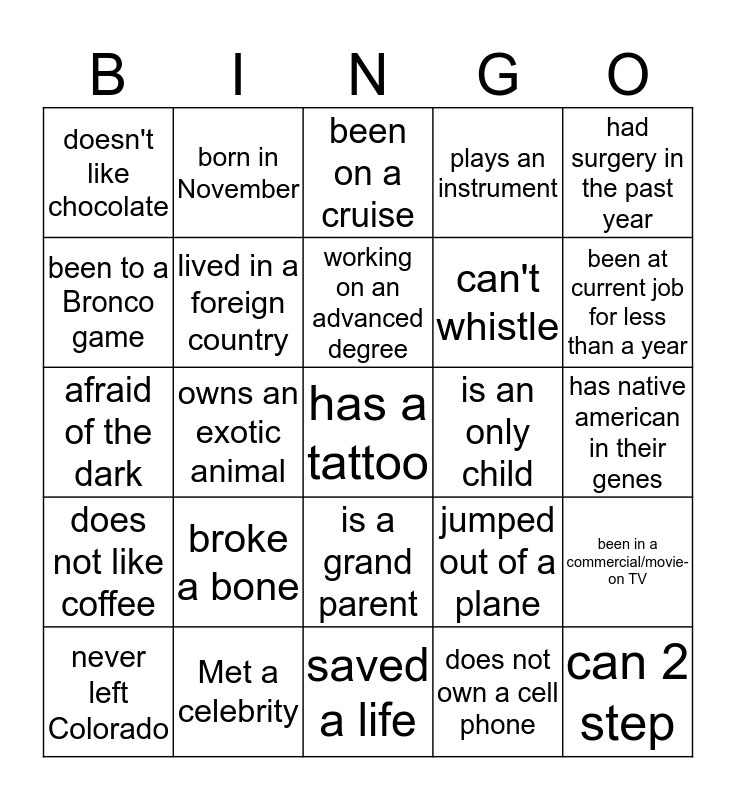 This bingo card has a free space and 24 words: broke a bone, Met a celebrity, working on an advanced degree, never left Colorado, had surgery in the past year, doesn't like chocolate, been to a Bronco game, born in November, is an only child, is a grand parent, can't whistle, afraid of the dark, jumped out of a plane, been in a commercial/movie-on TV, lived in a foreign country, does not own a cell phone, has native american in their genes, been on a cruise, been at current job for less than a year, owns an exotic animal, can 2 step, does not like coffee, plays an instrument and saved a life.