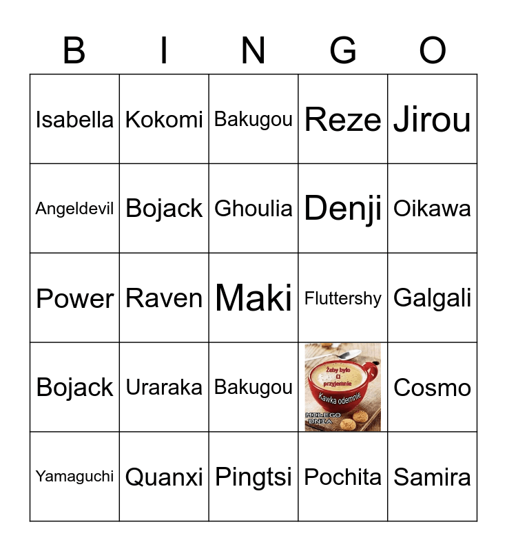 This bingo card has 1 images and 24 words: Uraraka, Pingtsi, Ghoulia, Yamaguchi, Jirou, Isabella, Angeldevil, Kokomi, Fluttershy, Bakugou, Denji, Power, Cosmo, Bojack, Samira, Galgali, Bakugou, Oikawa, Raven, Maki, Quanxi, Bojack, Reze and Pochita.