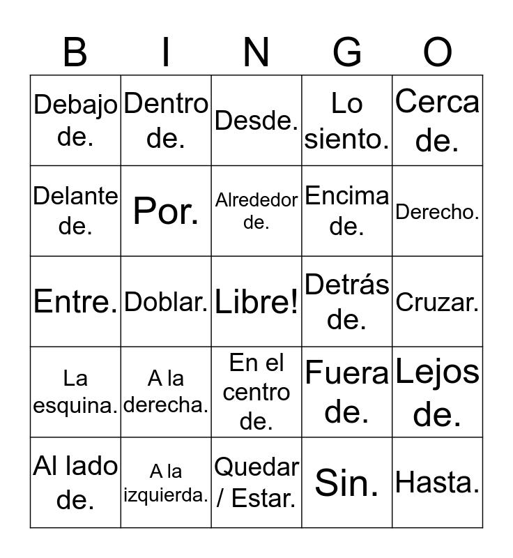 This bingo card has a free space and 24 words: A la derecha., A la izquierda., Alrededor de., Al lado de., Cerca de., Debajo de., Delante de., Dentro de., Detrás de., En el centro de., Encima de., Entre., Fuera de., Lejos de., Por., Sin., Cruzar., Desde., Derecho., Doblar., Hasta., La esquina., Lo siento. and Quedar / Estar..