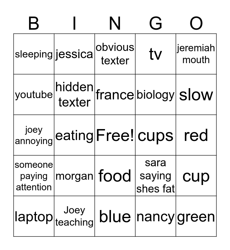 This bingo card has a free space and 30 words: Joey teaching, eyebrow Twitch, eating, bitchface, sleeping, obvious texter, hidden texter, food, cups, blue, red, green, nancy, fat, slow, idiot, sara saying shes fat, someone paying attention, morgan, jeremiah mouth, joey annoying, zebendon, jessica, biology, youtube, tv, cup, laptop, france and bomb.