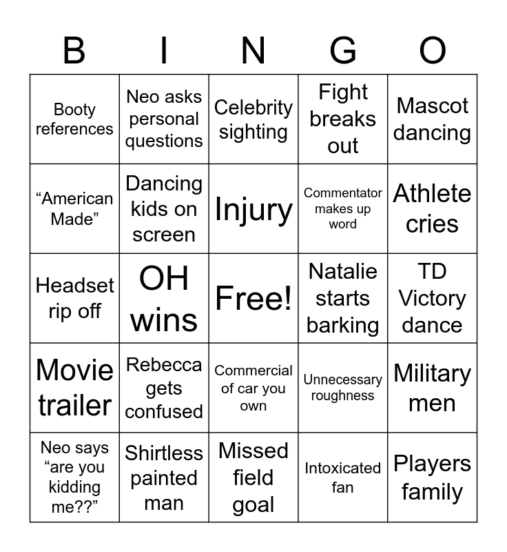 This bingo card has a free space and 29 words: Neo says “are you kidding me??”, GA wins, OH wins, A fight breaks out, Booty references, Celebrity sighting, Dancing kids on screen, Rebecca gets confused, Natalie starts barking, Shirtless painted man, TD Victory dance, Players family, Missed field goal, Intoxicated fan, Athlete cries, Insurance commercial, Commercial of car you own, Movie trailer, Mascot dancing, Headset rip off, Unnecessary roughness, CFA Cow, Commentator makes up word, “American Made”, Fight breaks out, Neo asks personal questions, Military men, Injury and Fireworks.
