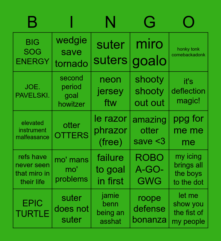 This bingo card has a free space and 24 words: mo' mans mo' problems, suter does not suter, neon jersey ftw, EPIC TURTLE, honky tonk comebackadonk, BIG SOG ENERGY, JOE. PAVELSKI., wedgie save tornado, amazing otter save <3, failure to goal in first, shooty shooty out out, elevated instrument malfeasance, ROBO A-GO-GWG, my icing brings all the boys to the dot, second period goal howitzer, roope defense bonanza, ppg for me me me, suter suters, it's deflection magic!, otter OTTERS, let me show you the fist of my people, refs have never seen that miro in their life, miro goalo and jamie benn being an asshat.
