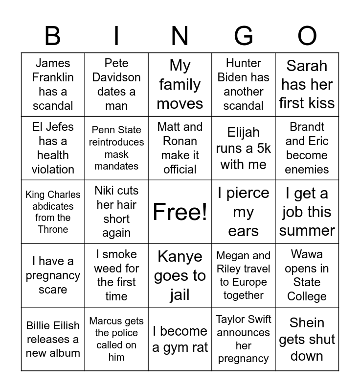 This bingo card has a free space and 24 words: I smoke weed for the first time, Marcus gets the police called on him, Matt and Ronan make it official, Billie Eilish releases a new album, Sarah has her first kiss, James Franklin has a scandal, El Jefes has a health violation, Pete Davidson dates a man, I pierce my ears, Kanye goes to jail, Elijah runs a 5k with me, King Charles abdicates from the Throne, Megan and Riley travel to Europe together, Wawa opens in State College, Penn State reintroduces mask mandates, Taylor Swift announces her pregnancy, I get a job this summer, My family moves, Brandt and Eric become enemies, Niki cuts her hair short again, Shein gets shut down, I have a pregnancy scare, Hunter Biden has another scandal and I become a gym rat.