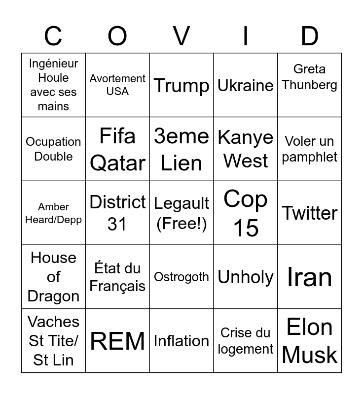 This bingo card has a free space and 39 words: Johnny Depp, Freedom Convoy, Chèque 600$, Fifa Qatar, Vaches St Tite/ St Lin, Ostrogoth, 3eme Lien, Reine Elizabeth, Greta Thunberg, House of Dragon, District 31, Ukraine, Elon Musk, Twitter, Cop 15, État du Français, Serment au roi, Ingénieur Houle avec ses mains, Éric Duhaime, Unholy, Ocupation Double, Inflation, Kanye West, Voler un pamphlet, File pour passports, Will Smith Slap, Ye, Vol de SunWing, Guy Lafleur, Avortement USA, 90 députés 30% des votes, Travaux Louis Hip Lafontaine, Trump, REM, Crise du logement, Assassinat Abe Shinzo, Iran, Amber Heard/Depp and Beijing Olympics.