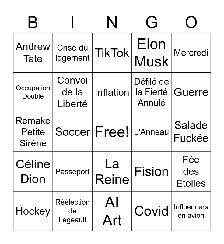 This bingo card has a free space and 26 words: La Reine, Covid, Inflation, Réélection de Legeault, Mercredi, Andrew Tate, Occupation Double, Crise du logement, Salade Fuckée, Fision, Défilé de la Fierté Annulé, Remake Petite Sirène, Fée des Etoiles, Hockey, Soccer, Twitter, Elon Musk, Céline Dion, TikTok, Influencers en avion, Guerre, AI Art, L'Anneau, Passeport, Convoi de la Liberté and Soupe sur Peintures.