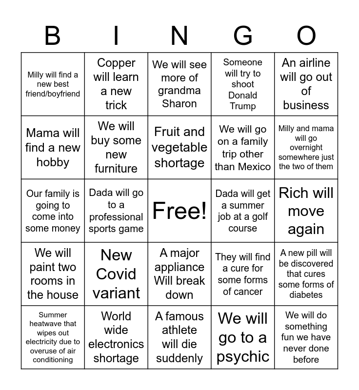 This bingo card has a free space and 24 words: New Covid variant, World wide electronics shortage, Fruit and vegetable shortage, Summer heatwave that wipes out electricity due to overuse of air conditioning, An airline will go out of business, Milly will find a new best friend/boyfriend, Mama will find a new hobby, Copper will learn a new trick, Dada will get a summer job at a golf course, A major appliance Will break down, We will go on a family trip other than Mexico, Our family is going to come into some money, They will find a cure for some forms of cancer, A new pill will be discovered that cures some forms of diabetes, We will buy some new furniture, We will go to a psychic, Rich will move again, We will see more of grandma Sharon, Milly and mama will go overnight somewhere just the two of them, Dada will go to a professional sports game, We will do something fun we have never done before, We will paint two rooms in the house, Someone will try to shoot Donald Trump and A famous athlete will die suddenly.