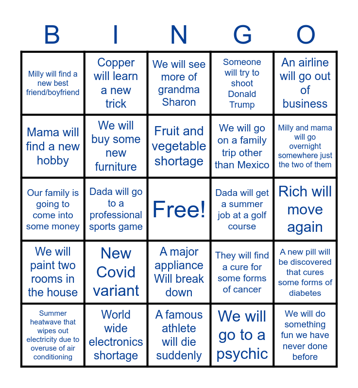 This bingo card has a free space and 24 words: New Covid variant, World wide electronics shortage, Fruit and vegetable shortage, Summer heatwave that wipes out electricity due to overuse of air conditioning, An airline will go out of business, Milly will find a new best friend/boyfriend, Mama will find a new hobby, Copper will learn a new trick, Dada will get a summer job at a golf course, A major appliance Will break down, We will go on a family trip other than Mexico, Our family is going to come into some money, They will find a cure for some forms of cancer, A new pill will be discovered that cures some forms of diabetes, We will buy some new furniture, We will go to a psychic, Rich will move again, We will see more of grandma Sharon, Milly and mama will go overnight somewhere just the two of them, Dada will go to a professional sports game, We will do something fun we have never done before, We will paint two rooms in the house, Someone will try to shoot Donald Trump and A famous athlete will die suddenly.