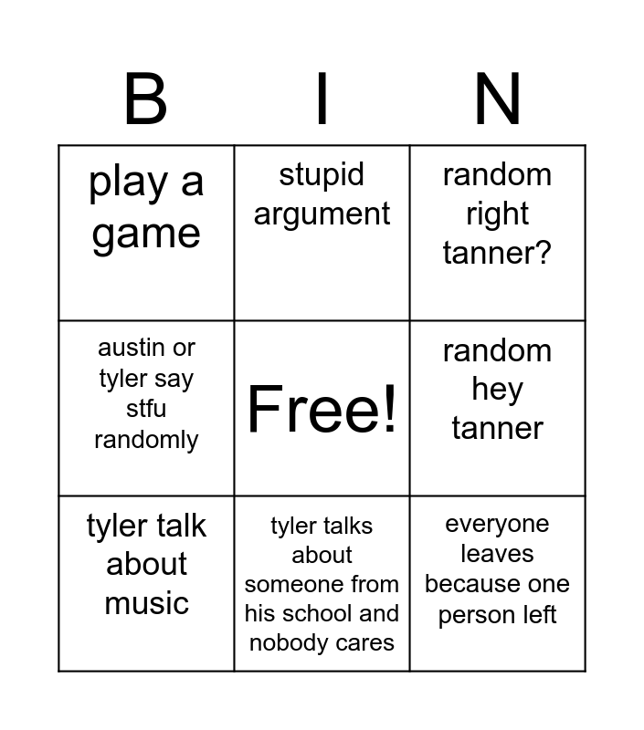 This bingo card has a free space and 8 words: random hey tanner, random right tanner?, stupid argument, tyler talk about music, play a game, everyone leaves because one person left, austin or tyler say stfu randomly and tyler talks about someone from his school and nobody cares.