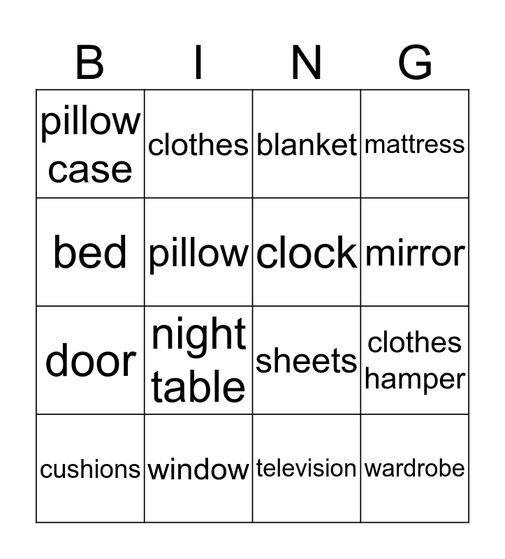 This bingo card has 16 words: window, clothes hamper, blanket, pillow case, door, clothes, sheets, television, bed, pillow, cushions, mattress, night table, mirror, clock and wardrobe.