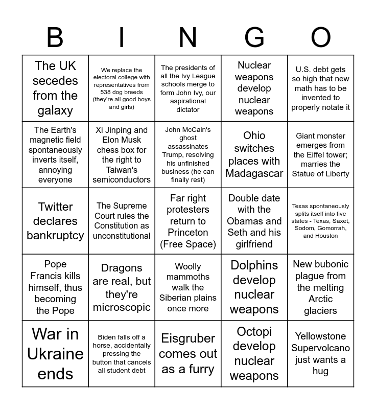 This bingo card has a free space and 24 words: Dragons are real, but they're microscopic, Biden falls off a horse, accidentally pressing the button that cancels all student debt, John McCain's ghost assassinates Trump, resolving his unfinished business (he can finally rest), War in Ukraine ends, U.S. debt gets so high that new math has to be invented to properly notate it, The UK secedes from the galaxy, The Earth's magnetic field spontaneously inverts itself, annoying everyone, We replace the electoral college with representatives from 538 dog breeds (they're all good boys and girls), Double date with the Obamas and Seth and his girlfriend, Woolly mammoths walk the Siberian plains once more, Ohio switches places with Madagascar, Twitter declares bankruptcy, Dolphins develop nuclear weapons, New bubonic plague from the melting Arctic glaciers, Xi Jinping and Elon Musk chess box for the right to Taiwan's semiconductors, Octopi develop nuclear weapons, Texas spontaneously splits itself into five states - Texas, Saxet, Sodom, Gomorrah, and Houston, The presidents of all the Ivy League schools merge to form John Ivy, our aspirational dictator, Giant monster emerges from the Eiffel tower; marries the Statue of Liberty, The Supreme Court rules the Constitution as unconstitutional, Yellowstone Supervolcano just wants a hug, Pope Francis kills himself, thus becoming the Pope, Nuclear weapons develop nuclear weapons and Eisgruber comes out as a furry.