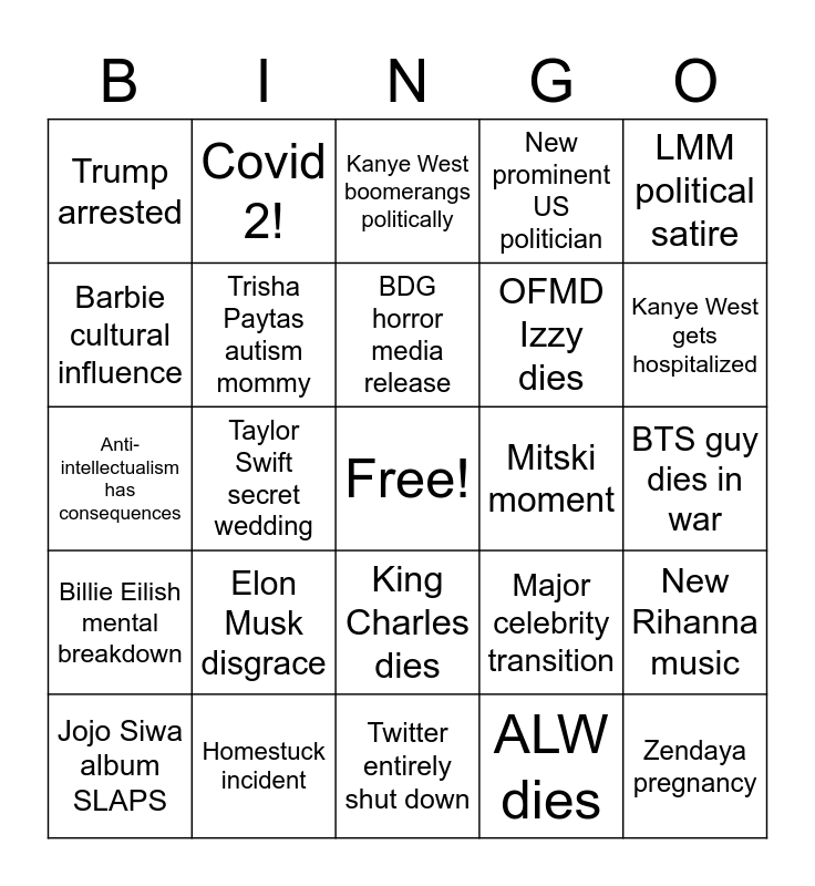 This bingo card has a free space and 24 words: Elon Musk disgrace, Homestuck incident, BDG horror media release, Jojo Siwa album SLAPS, LMM political satire, Trump arrested, Barbie cultural influence, Covid 2!, Mitski moment, King Charles dies, OFMD Izzy dies, Anti-intellectualism has consequences, Major celebrity transition, New Rihanna music, Trisha Paytas autism mommy, ALW dies, BTS guy dies in war, Kanye West boomerangs politically, Kanye West gets hospitalized, Taylor Swift secret wedding, Zendaya pregnancy, Billie Eilish mental breakdown, New prominent US politician and Twitter entirely shut down.