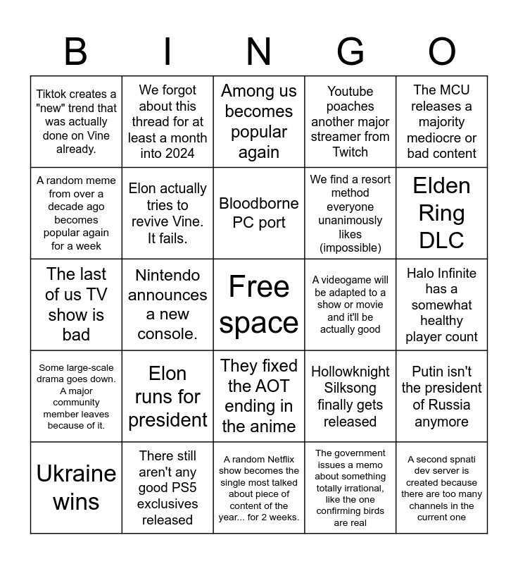 This bingo card has a free space and 24 words: Elon runs for president, There still aren't any good PS5 exclusives released, Bloodborne PC port, Ukraine wins, The MCU releases a majority mediocre or bad content, Tiktok creates a "new" trend that was actually done on Vine already., A random meme from over a decade ago becomes popular again for a week, We forgot about this thread for at least a month into 2024, A videogame will be adapted to a show or movie and it'll be actually good, They fixed the AOT ending in the anime, We find a resort method everyone unanimously likes (impossible), The last of us TV show is bad, Hollowknight Silksong finally gets released, Putin isn't the president of Russia anymore, Elon actually tries to revive Vine. It fails., The government issues a memo about something totally irrational, like the one confirming birds are real, Halo Infinite has a somewhat healthy player count, Among us becomes popular again, Elden Ring DLC, Nintendo announces a new console., A second spnati dev server is created because there are too many channels in the current one, Some large-scale drama goes down. A major community member leaves because of it., Youtube poaches another major streamer from Twitch and A random Netflix show becomes the single most talked about piece of content of the year... for 2 weeks..