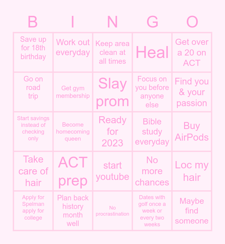 This bingo card has a free space and 24 words: Apply for Spelman apply for college, ACT prep, Slay prom, Dates with golf once a week or every two weeks, Get over a 20 on ACT, Save up for 18th birthday, Work out everyday, Keep area clean at all times, Bible study everyday, Buy AirPods, Start savings instead of checking only, Get gym membership, No more chances, Loc my hair, Go on road trip, Plan back history month well, No procrastination, Heal, Find you & your passion, Take care of hair, Become homecoming queen, start youtube, Focus on you before anyone else and Maybe find someone.