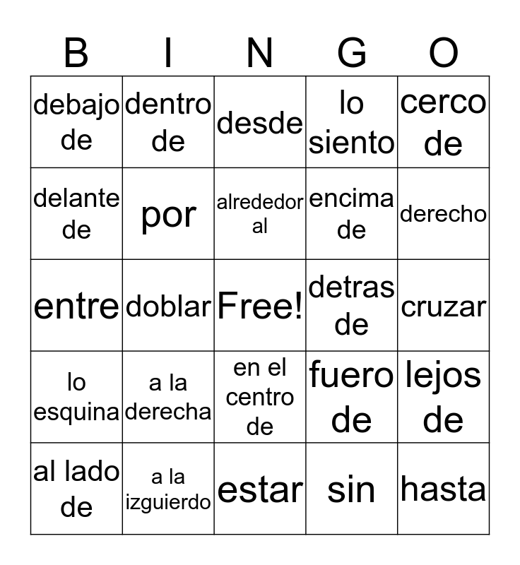 This bingo card has a free space and 24 words: a la derecha, a la izguierdo, alrededor al, al lado de, cerco de, debajo de, delante de, dentro de, detras de, en el centro de, encima de, entre, fuero de, lejos de, por, sin, cruzar, desde, derecho, doblar, hasta, lo esquina, lo siento and estar.