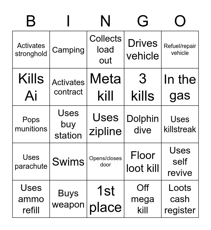 This bingo card has a free space and 24 words: Swims, Buys weapon, Meta kill, Uses ammo refill, Refuel/repair vehicle, Activates stronghold, Kills Ai, Camping, Dolphin dive, Opens/closes door, 3 kills, Pops munitions, Floor loot kill, Uses self revive, Activates contract, Off mega kill, Uses killstreak, Collects load out, In the gas, Uses buy station, Loots cash register, Uses parachute, Drives vehicle and 1st place.
