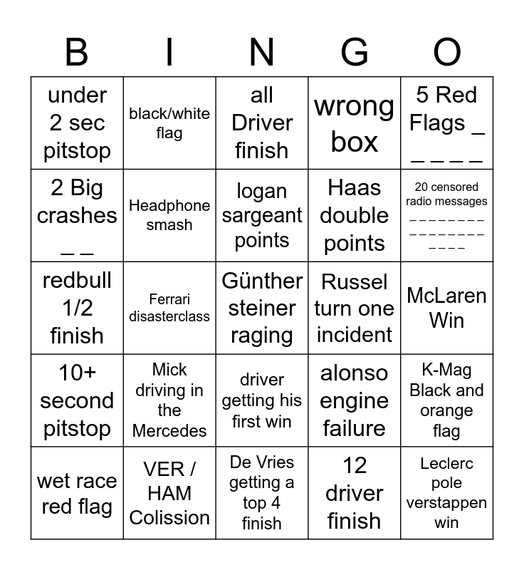 This bingo card has a free space and 24 words: Mick driving in the Mercedes, VER / HAM Colission, logan sargeant points, wet race red flag, 5 Red Flags _ _ _ _ _, under 2 sec pitstop, 2 Big crashes _ _, black/white flag, Russel turn one incident, driver getting his first win, Haas double points, redbull 1/2 finish, alonso engine failure, K-Mag Black and orange flag, Headphone smash, 12 driver finish, McLaren Win, all Driver finish, 20 censored radio messages _ _ _ _ _ _ _ _ _ _ _ _ _ _ _ _ _ _ _ _, Ferrari disasterclass, Leclerc pole verstappen win, 10+ second pitstop, wrong box and De Vries getting a top 4 finish.