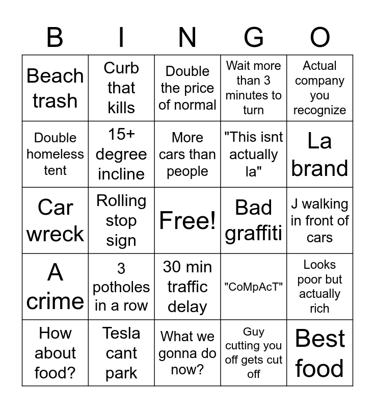 This bingo card has a free space and 24 words: 3 potholes in a row, Tesla cant park, More cars than people, How about food?, Actual company you recognize, Beach trash, Double homeless tent, Curb that kills, Bad graffiti, 30 min traffic delay, "This isnt actually la", Car wreck, "CoMpAcT", Looks poor but actually rich, 15+ degree incline, Guy cutting you off gets cut off, J walking in front of cars, Double the price of normal, La brand, Rolling stop sign, Best food, A crime, Wait more than 3 minutes to turn and What we gonna do now?.