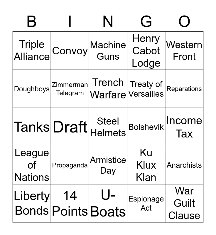 This bingo card has a free space and 24 words: Propaganda, 14 Points, Trench Warfare, Liberty Bonds, Western Front, Triple Alliance, Doughboys, Convoy, Bolshevik, Armistice Day, Treaty of Versailles, Tanks, Ku Klux Klan, Anarchists, Zimmerman Telegram, Espionage Act, Income Tax, Machine Guns, Reparations, Draft, War Guilt Clause, League of Nations, Henry Cabot Lodge and U-Boats.