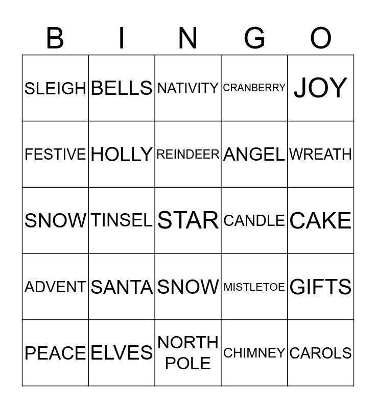 This bingo card has a free space and 24 words: SANTA, ELVES, REINDEER, PEACE, JOY, SLEIGH, FESTIVE, BELLS, CANDLE, SNOW, ANGEL, SNOW, MISTLETOE, GIFTS, HOLLY, CHIMNEY, CAKE, NATIVITY, WREATH, TINSEL, CAROLS, ADVENT, CRANBERRY and NORTH POLE.