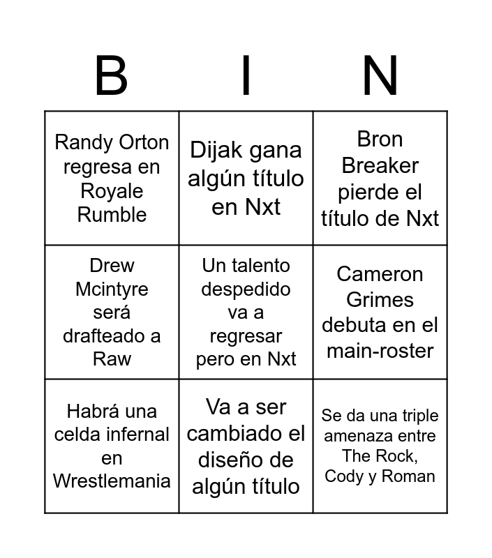 This bingo card has a free space and 8 words: Cameron Grimes debuta en el main-roster, Bron Breaker pierde el título de Nxt, Dijak gana algún título en Nxt, Habrá una celda infernal en Wrestlemania, Randy Orton regresa en Royale Rumble, Se da una triple amenaza entre The Rock, Cody y Roman, Drew Mcintyre será drafteado a Raw and Va a ser cambiado el diseño de algún título.