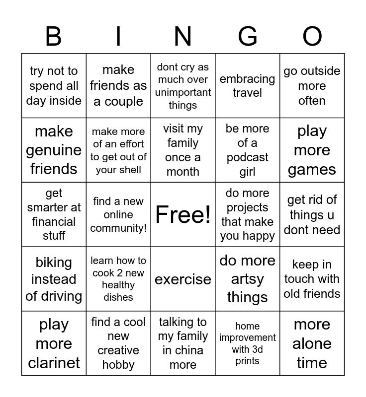 This bingo card has a free space and 24 words: learn how to cook 2 new healthy dishes, find a cool new creative hobby, visit my family once a month, play more clarinet, go outside more often, try not to spend all day inside, make genuine friends, make friends as a couple, do more projects that make you happy, exercise, be more of a podcast girl, get smarter at financial stuff, do more artsy things, keep in touch with old friends, make more of an effort to get out of your shell, home improvement with 3d prints, get rid of things u dont need, dont cry as much over unimportant things, play more games, find a new online community!, more alone time, biking instead of driving, embracing travel and talking to my family in china more.