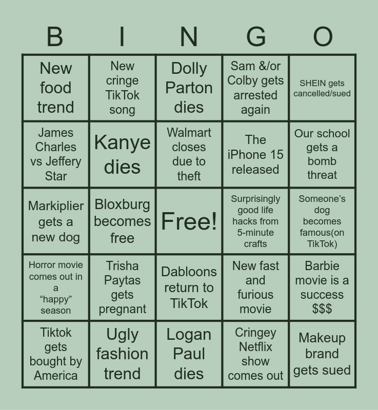 This bingo card has a free space and 24 words: Trisha Paytas gets pregnant, Ugly fashion trend, Walmart closes due to theft, Tiktok gets bought by America, SHEIN gets cancelled/sued, New food trend, James Charles vs Jeffery Star, New cringe TikTok song, Surprisingly good life hacks from 5-minute crafts, Dabloons return to TikTok, The iPhone 15 released, Markiplier gets a new dog, New fast and furious movie, Barbie movie is a success $$$, Kanye dies, Cringey Netflix show comes out, Someone’s dog becomes famous(on TikTok), Dolly Parton dies, Our school gets a bomb threat, Bloxburg becomes free, Makeup brand gets sued, Horror movie comes out in a “happy” season, Sam &/or Colby gets arrested again and Logan Paul dies.