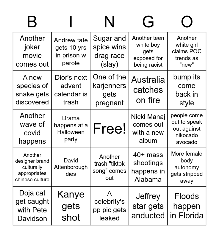 This bingo card has a free space and 24 words: David Attenborough dies, Kanye gets shot, One of the karjenners gets pregnant, Doja cat get caught with Pete Davidson, Another white girl claims POC trends as "new", Another joker movie comes out, A new species of snake gets discovered, Andrew tate gets 10 yrs in prison w parole, Nicki Manaj comes out with a new album, Another trash "tiktok song" comes out, Australia catches on fire, Another wave of covid happens, 40+ mass shootings happens in Alabama, More female body autonomy gets stripped away, Dior's next advent calendar is trash, Jeffrey star gets anducted, people come out to speak out against nikocado avocado, Sugar and spice wins drag race (slay), bump its come back in style, Drama happens at a Halloween party, Floods happen in Florida, Another designer brand culturally appropriates chinese culture, Another teen white boy gets exposed for being racist and A celebrity's pp pic gets leaked.
