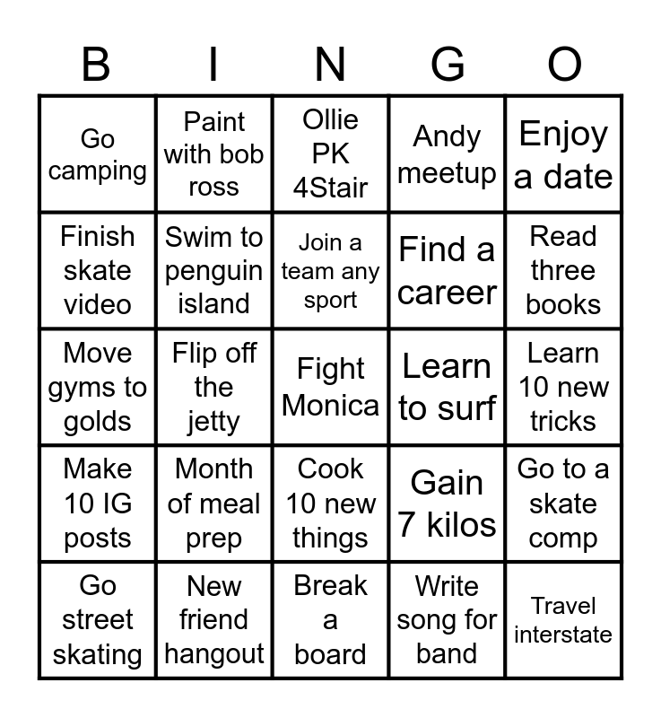 This bingo card has a free space and 24 words: Month of meal prep, New friend hangout, Join a team any sport, Go street skating, Enjoy a date, Go camping, Finish skate video, Paint with bob ross, Learn to surf, Cook 10 new things, Find a career, Move gyms to golds, Gain 7 kilos, Go to a skate comp, Swim to penguin island, Write song for band, Learn 10 new tricks, Ollie PK 4Stair, Read three books, Flip off the jetty, Travel interstate, Make 10 IG posts, Andy meetup and Break a board.