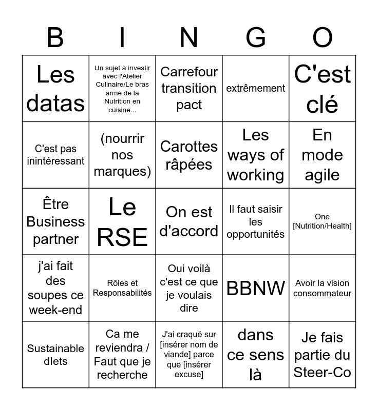 This bingo card has 25 words: Rôles et Responsabilités, J'ai craqué sur [insérer nom de viande] parce que [insérer excuse], Carottes râpées, Sustainable dIets, C'est clé, Les datas, C'est pas inintéressant, Un sujet à investir avec l'Atelier Culinaire/Le bras armé de la Nutrition en cuisine..., Il faut saisir les opportunités, Oui voilà c'est ce que je voulais dire, Les ways of working, Être Business partner, BBNW, Avoir la vision consommateur, (nourrir nos marques), Je fais partie du Steer-Co, One [Nutrition/Health], Carrefour transition pact, En mode agile, Le RSE, On est d'accord, Ca me reviendra / Faut que je recherche, j'ai fait des soupes ce week-end, extrêmement and dans ce sens là.
