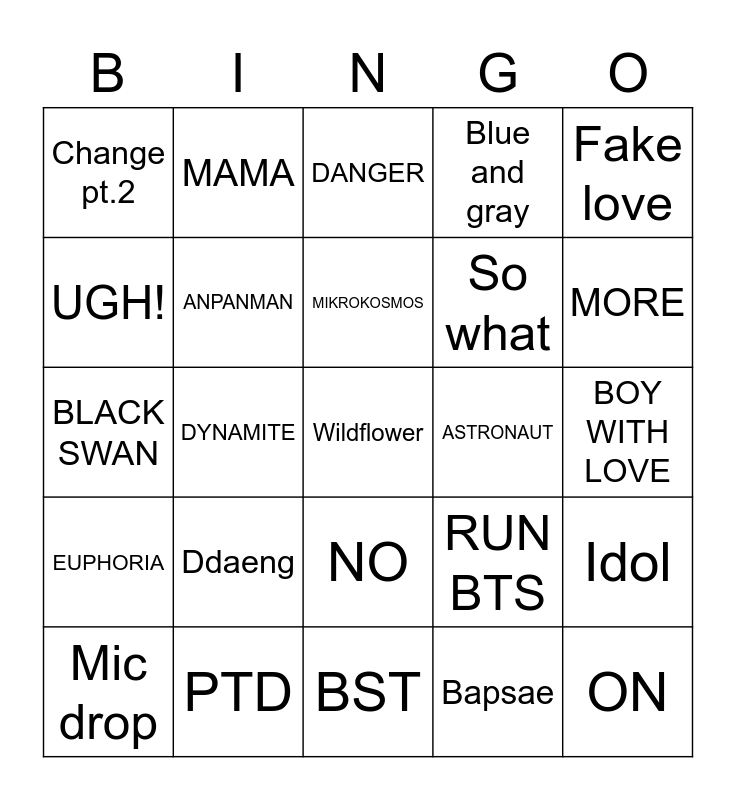This bingo card has a free space and 24 words: Ddaeng, PTD, MIKROKOSMOS, Mic drop, Fake love, Change pt.2, UGH!, MAMA, ASTRONAUT, NO, So what, BLACK SWAN, RUN BTS, Idol, ANPANMAN, Bapsae, BOY WITH LOVE, DANGER, MORE, DYNAMITE, ON, EUPHORIA, Blue and gray and BST.