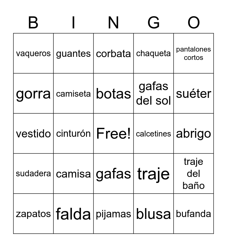 This bingo card has a free space and 24 words: camisa, falda, botas, zapatos, pantalones cortos, vaqueros, gorra, guantes, calcetines, gafas, gafas del sol, vestido, traje, traje del baño, camiseta, blusa, abrigo, corbata, suéter, cinturón, bufanda, sudadera, chaqueta and pijamas.