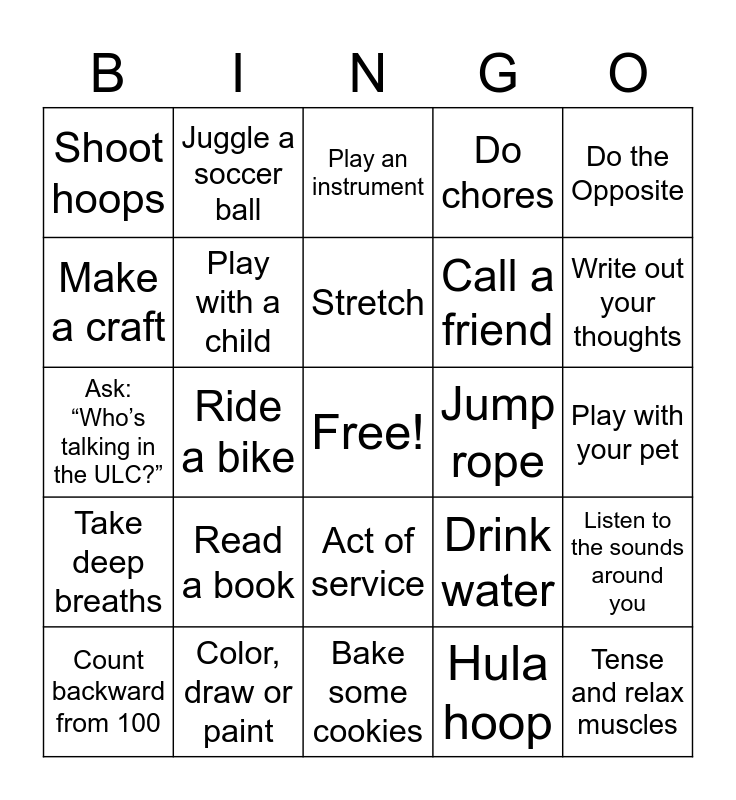 This bingo card has a free space and 35 words: Walk away, Pray for help, Confession, Play with a child, Act of service, Do chores, Make a craft, Listen to music, Stretch, Talk to an adult you look up to, Ask: “Who’s talking in the ULC?”, Do the Opposite, Jumping jacks, Run in place, Shoot hoops, Jump rope, Hula hoop, Ride a bike, Take deep breaths, Tense and relax muscles, Drink water, Count backward from 100, Listen to the sounds around you, Color, draw or paint, Play an instrument, Write out your thoughts, Make a gratitude list, Tell yourself a joke, Call a friend, Play with your pet, Facetime grandma/pa, Bake some cookies, Read a book, Juggle a soccer ball and Clean your room.