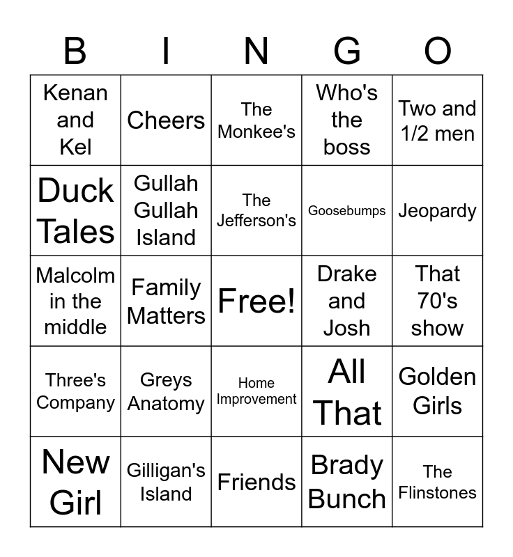 This bingo card has a free space and 40 words: Fresh Prince of Bel-Air, Malcolm in the middle, Married with Children, Gullah Gullah Island, Gilligan's Island, Home Improvement, The Jefferson's, Big Bang Theory, Two and 1/2 men, Three's Company, Family Matters, Who's the boss, The Flinstones, That 70's show, Drake and Josh, Greys Anatomy, Law and Order, Kenan and Kel, Facts of Life, The Monkee's, Golden Girls, Brady Bunch, Goosebumps, Duck Tales, The A-Team, The Office, South Park, Happy Days, Tiny Toons, Dinosaurs, Munsters, New Girl, Seinfeld, All That, Jeopardy, Friends, Jetsons, Rugrats, Cheers and CSI.