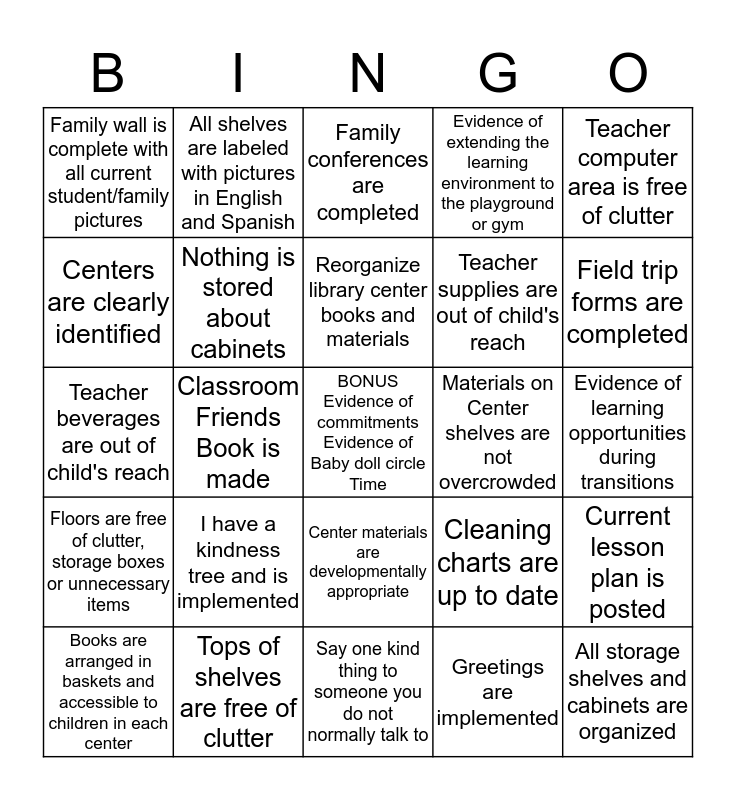 This bingo card has a free space and 24 words: I have a kindness tree and is implemented, Tops of shelves are free of clutter, Reorganize library center books and materials, Books are arranged in baskets and accessible to children in each center, Teacher computer area is free of clutter, Family wall is complete with all current student/family pictures, Centers are clearly identified, All shelves are labeled with pictures in English and Spanish, Materials on Center shelves are not overcrowded, Center materials are developmentally appropriate, Teacher supplies are out of child's reach, Teacher beverages are out of child's reach, Cleaning charts are up to date, Current lesson plan is posted, Nothing is stored about cabinets, Greetings are implemented, Evidence of learning opportunities during transitions, Family conferences are completed, Field trip forms are completed, Classroom Friends Book is made, All storage shelves and cabinets are organized, Floors are free of clutter, storage boxes or unnecessary items, Evidence of extending the learning environment to the playground or gym and Say one kind thing to someone you do not normally talk to.