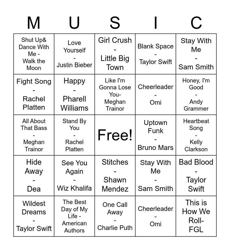 This bingo card has a free space and 24 words: Wildest Dreams - Taylor Swift, See You Again - Wiz Khalifa, Like I'm Gonna Lose You- Meghan Trainor, Cheerleader - Omi, Stay With Me - Sam Smith, Shut Up& Dance With Me - Walk the Moon, Love Yourself - Justin Bieber, Girl Crush - Little Big Town, Uptown Funk - Bruno Mars, Heartbeat Song - Kelly Clarkson, All About That Bass - Meghan Trainor, Happy - Pharell Williams, Stay With Me - Sam Smith, Bad Blood - Taylor Swift, Fight Song - Rachel Platten, The Best Day of My Life - American Authors, One Call Away - Charlie Puth, Blank Space - Taylor Swift, Honey, I'm Good - Andy Grammer, Hide Away - Dea, Stand By You - Rachel Platten, Stitches - Shawn Mendez, Cheerleader - Omi and This is How We Roll- FGL.