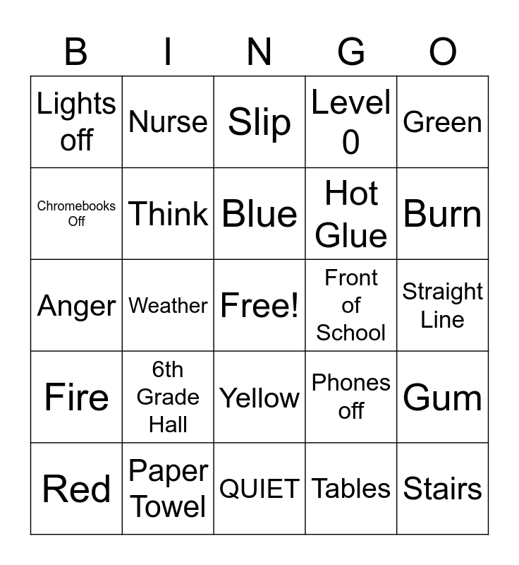 This bingo card has a free space and 39 words: Safety, Stop, Act, Think, Red, Yellow, Blue, Red, Green, Fire, Weather, Level 0, Stairs, Straight Line, Front of School, 6th Grade Hall, Closet, Lights off, In Closet, Phones off, Chromebooks Off, QUIET, Hot Glue, Burn, No Horseplay, Outlet, Charger, Scissors, Blood, Nurse, Pass, Water, Slip, Paper Towel, Tables, Writing, Gum, Anger and Sub.