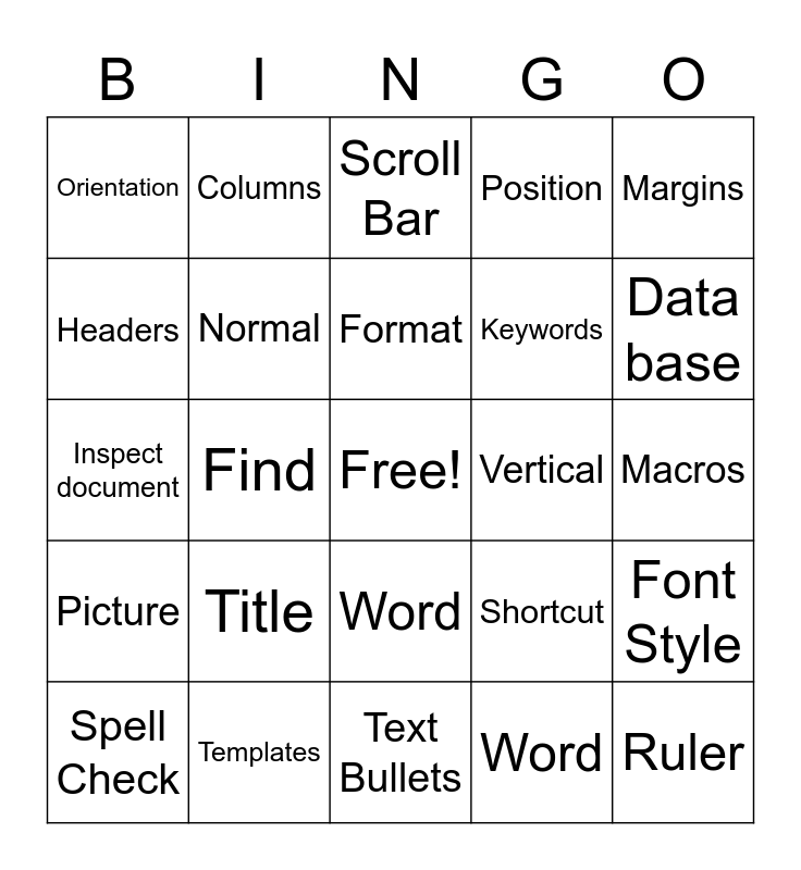 This bingo card has a free space and 26 words: Word, Word, Format, Templates, Margins, Orientation, Headers, Columns, Macros, Shortcut, Keywords, Inspect document, Font Style, Spell Check, Find, Edit, Position, Picture, Scroll Bar, Ruler, Data base, Text Bullets, Vertical, Title, Normal and Superscript.