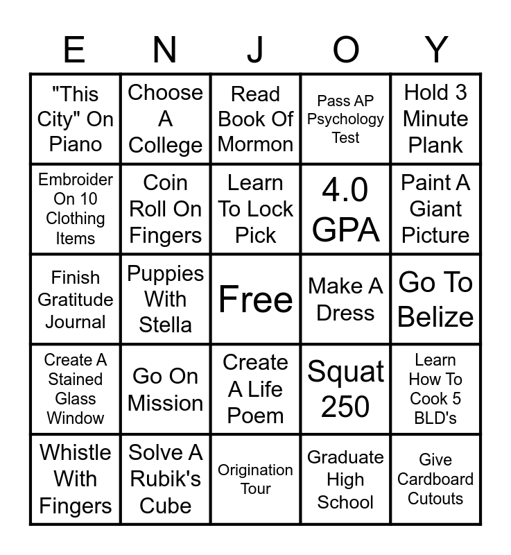 This bingo card has a free space and 24 words: Go On Mission, Solve A Rubik's Cube, Learn To Lock Pick, Whistle With Fingers, Hold 3 Minute Plank, "This City" On Piano, Embroider On 10 Clothing Items, Choose A College, Make A Dress, Create A Life Poem, 4.0 GPA, Finish Gratitude Journal, Squat 250, Learn How To Cook 5 BLD's, Coin Roll On Fingers, Graduate High School, Go To Belize, Read Book Of Mormon, Paint A Giant Picture, Puppies With Stella, Give Cardboard Cutouts, Create A Stained Glass Window, Pass AP Psychology Test and Origination Tour.