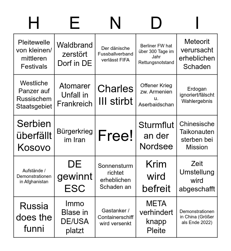 This bingo card has a free space and 24 words: DE gewinnt ESC, Immo Blase in DE/USA platzt, Charles III stirbt, Russia does the funni, Meteorit verursacht erheblichen Schaden, Pleitewelle von kleinen/ mittleren Festivals, Westliche Panzer auf Russischem Staatsgebiet, Waldbrand zerstört Dorf in DE, Sturmflut an der Nordsee, Sonnensturm richtet erheblichen Schaden an, Offener Krieg zw. Armenien u. Aserbaidschan, Serbien überfällt Kosovo, Krim wird befreit, Zeit Umstellung wird abgeschafft, Atomarer Unfall in Frankreich, META verhindert knapp Pleite, Chinesische Taikonauten sterben bei Mission, Der dänische Fussballverband verlässt FIFA, Erdogan ignoriert/fälscht Wahlergebnis, Bürgerkrieg im Iran, Demonstrationen in China (Größer als Ende 2022), Aufstände / Demonstrationen in Afghanistan, Berliner FW hat über 300 Tage im Jahr Rettungsnotstand and Gastanker / Containerschiff wird versenkt.