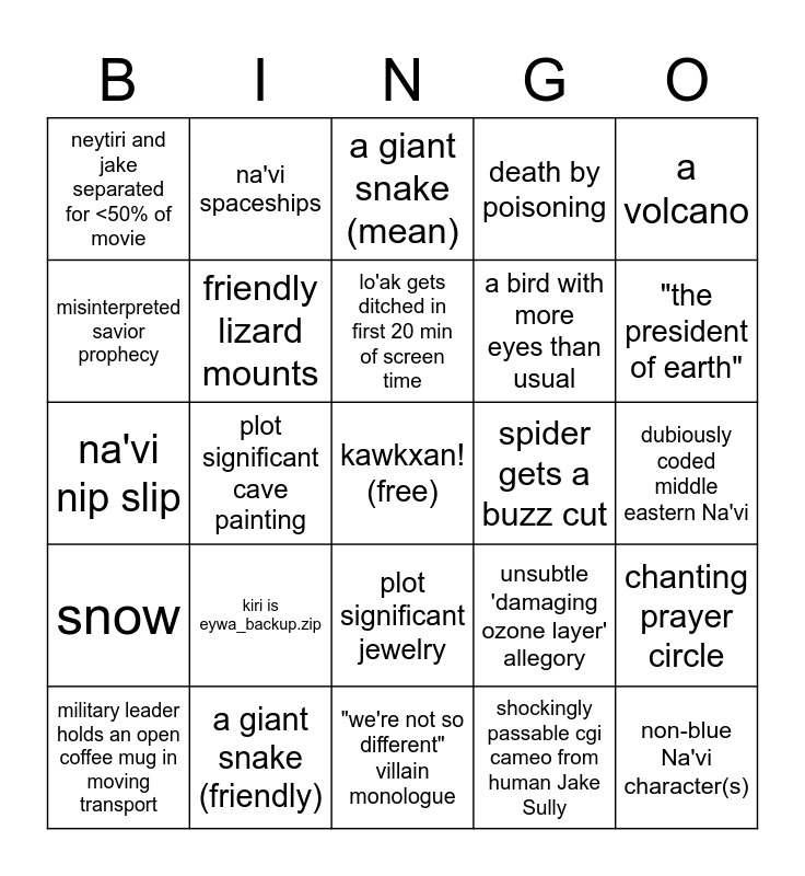 This bingo card has a free space and 24 words: kiri is eywa_backup.zip, a giant snake (friendly), lo'ak gets ditched in first 20 min of screen time, military leader holds an open coffee mug in moving transport, a volcano, neytiri and jake separated for <50% of movie, misinterpreted savior prophecy, na'vi spaceships, spider gets a buzz cut, plot significant jewelry, a bird with more eyes than usual, na'vi nip slip, unsubtle 'damaging ozone layer' allegory, chanting prayer circle, friendly lizard mounts, shockingly passable cgi cameo from human Jake Sully, dubiously coded middle eastern Na'vi, a giant snake (mean), "the president of earth", plot significant cave painting, non-blue Na'vi character(s), snow, death by poisoning and "we're not so different" villain monologue.