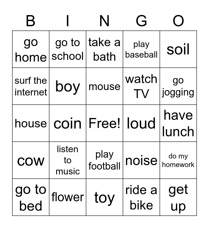 This bingo card has a free space and 24 words: listen to music, flower, mouse, go to bed, soil, go home, surf the internet, go to school, loud, play football, watch TV, house, noise, do my homework, boy, ride a bike, have lunch, take a bath, go jogging, coin, get up, cow, play baseball and toy.