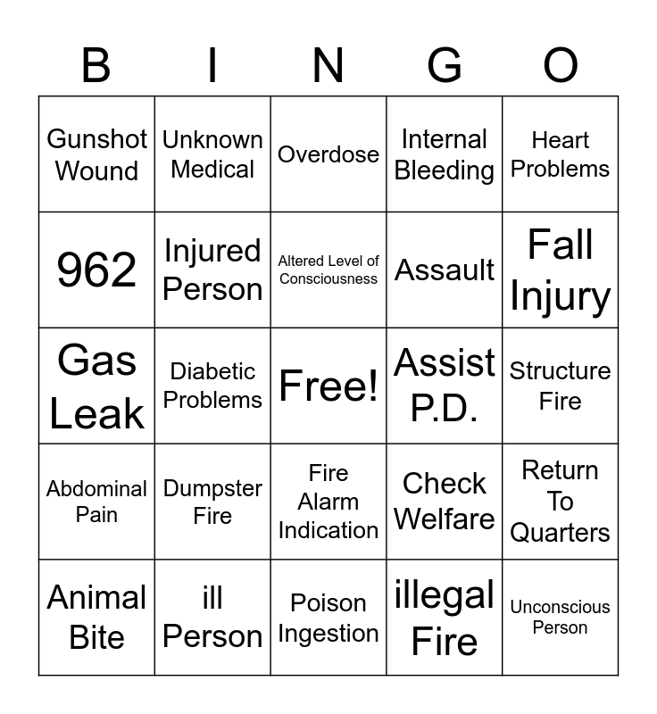 This bingo card has a free space and 38 words: Seizure, Difficulty Breathing, Chest Pain, Injured Person, Return To Quarters, Dumpster Fire, Altered Level of Consciousness, Service Call, Heart Problems, Assault, Diabetic Problems, Internal Bleeding, Unconscious Person, Structure Fire, 962, Abdominal Pain, Medical Alarm, Overdose, Unknown Fire, Assist P.D., Gunshot Wound, ill Person, Fall Injury, Animal Bite, Child Birth, Poison Ingestion, Hazardous Situation, Apartment Fire, Electrocution, Maternity Problems, Hanging, Fire Alarm Indication, illegal Fire, Unknown Medical, House Fire, Check Welfare, Gas Leak and Code.
