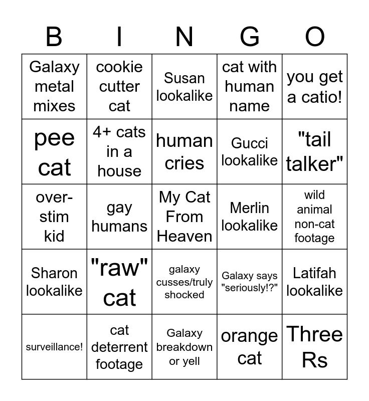 This bingo card has a free space and 40 words: owner is the problem, over-stim kid, medication!, 4+ cats in a house, cat deterrent footage, galaxy cusses/truly shocked, human cries, slow feeder bowl!, you get a catio!, Sharon lookalike, gay humans, cat with human name, Three Rs, wild animal non-cat footage, Merlin lookalike, "raw" cat, catification!, Galaxy metal mixes, main bully cat, Susan lookalike, Latifah lookalike, orange cat, Gucci lookalike, pee cat, cat bite/scratch, considering re-homing, baby kitten!!!, outdoor cat that isn't theirs, territorial insecurity, cat with object name, harness cat, surveillance!, uses red drawing tool on tablet, Galaxy says "seriously!?", "tail talker", Galaxy breakdown or yell, our TV freezes, boil and simmer, cookie cutter cat and cat helps/saves human.
