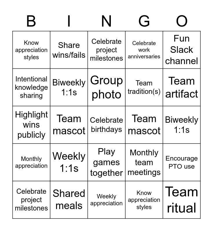 This bingo card has 1 images and 55 words: Monthly team meetings, Weekly 1:1s, Team mission/vision, Celebrate work anniversaries, Team ritual, Giving back together, Biweekly 1:1s, Intentional knowledge sharing, Team mascot, Play games together, Know appreciation styles, Fun Slack channel, Celebrate birthdays, Team goal(s), Weekly appreciation, 2+ team rituals, Share wins/fails, Celebrate project milestones, Shared meals, Team artifact, Monthly appreciation, Shared playlist, Group photo, Team tradition(s), Monthly non-work connect, Highlight wins publicly, Encourage PTO use, Monthly team meetings, Weekly 1:1s, Team mission/vision, Celebrate work anniversaries, Team ritual, Giving back together, Biweekly 1:1s, Intentional knowledge sharing, Team mascot, Play games together, Know appreciation styles, Fun Slack channel, Celebrate birthdays, Team goal(s), Weekly appreciation, 2+ team rituals, Share wins/fails, Celebrate project milestones, Shared meals, Team artifact, Monthly appreciation, Shared playlist, Group photo, Share EAP resources, Quarterly non-work connect, Highlight wins publicly, Encourage PTO use and Celebrate holidays.