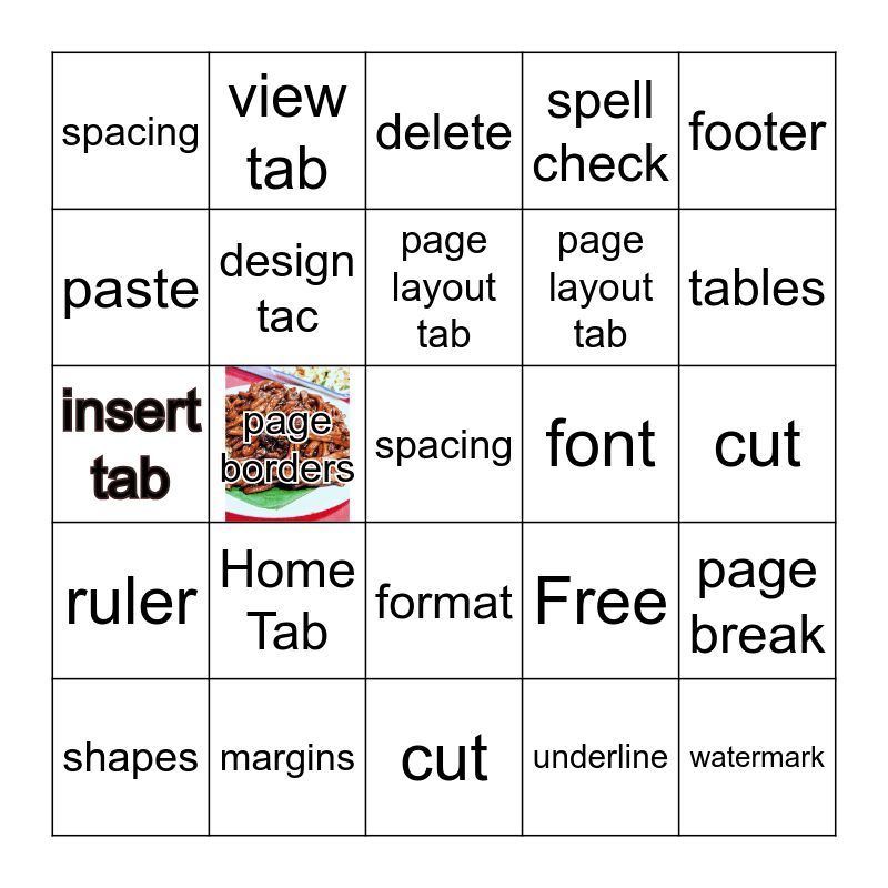 This bingo card has 1 images and 25 words: Home Tab, cut, page layout tab, shapes, footer, spacing, paste, view tab, font, format, page layout tab, insert tab, Free, page break, design tac, watermark, cut, delete, tables, page borders, spacing, margins, ruler, spell check and underline.