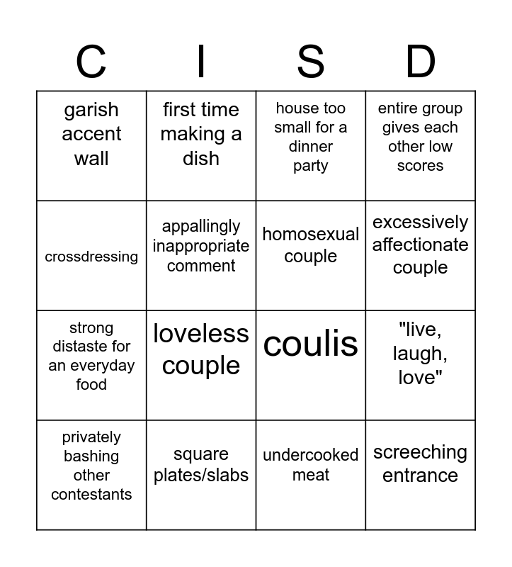 This bingo card has 16 words: square plates/slabs, "live, laugh, love", house too small for a dinner party, garish accent wall, strong distaste for an everyday food, first time making a dish, coulis, undercooked meat, crossdressing, appallingly inappropriate comment, privately bashing other contestants, entire group gives each other low scores, loveless couple, excessively affectionate couple, homosexual couple and screeching entrance.